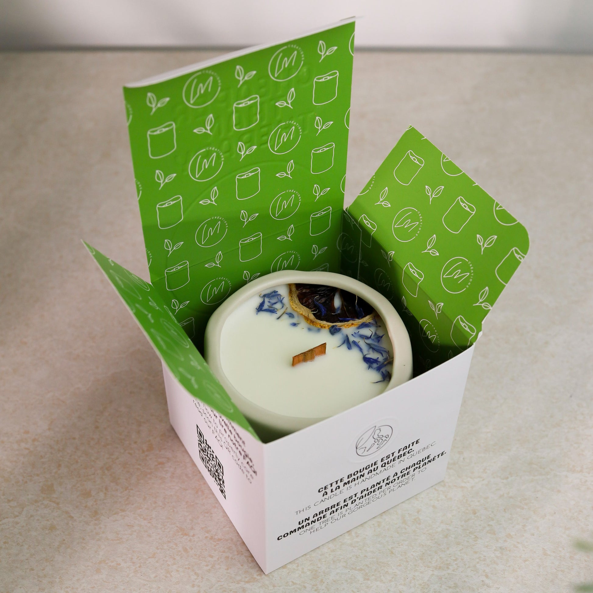 Nos bougies sont versées à la main au Québec! Elles sont faites de cire de soya à 100% et de fragrances non-toxiques. Elles sont sans parabène, végétaliennes et sans cruauté animale.