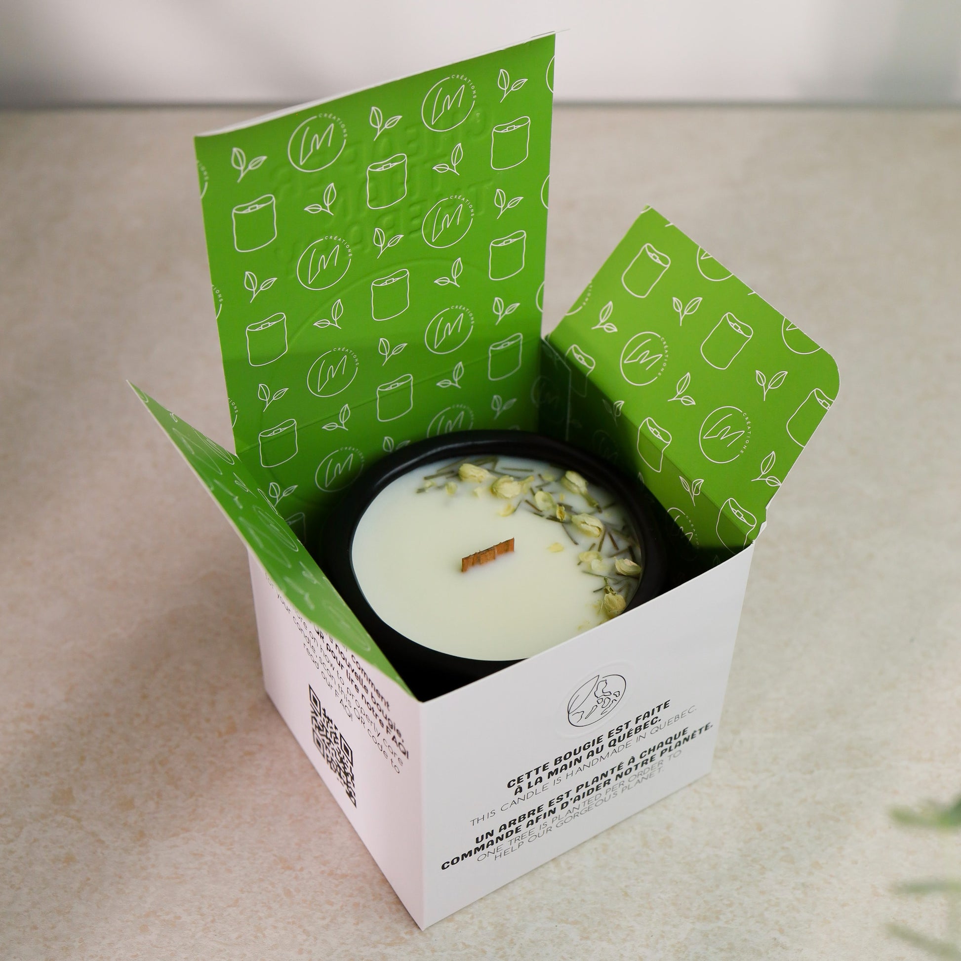 Nos bougies sont versées à la main au Québec! Elles sont faites de cire de soya à 100% et de fragrances non-toxiques. Elles sont sans parabène, végétaliennes et sans cruauté animale.